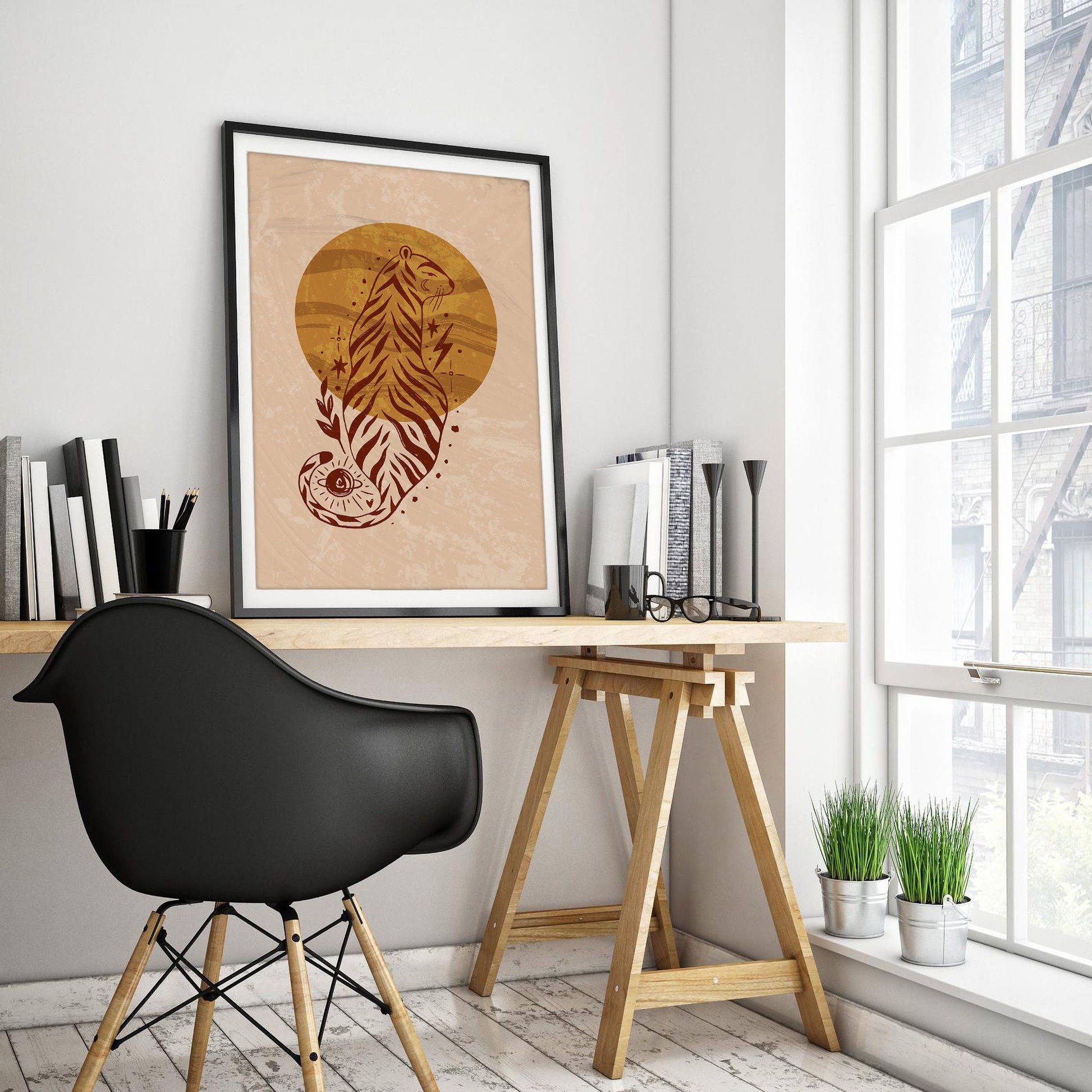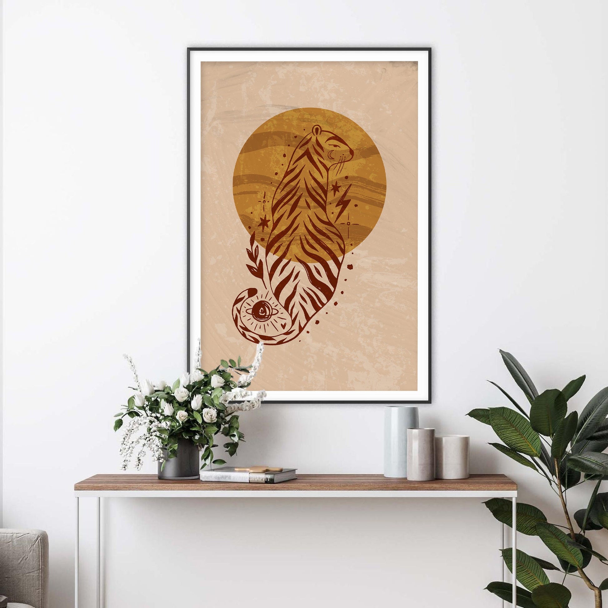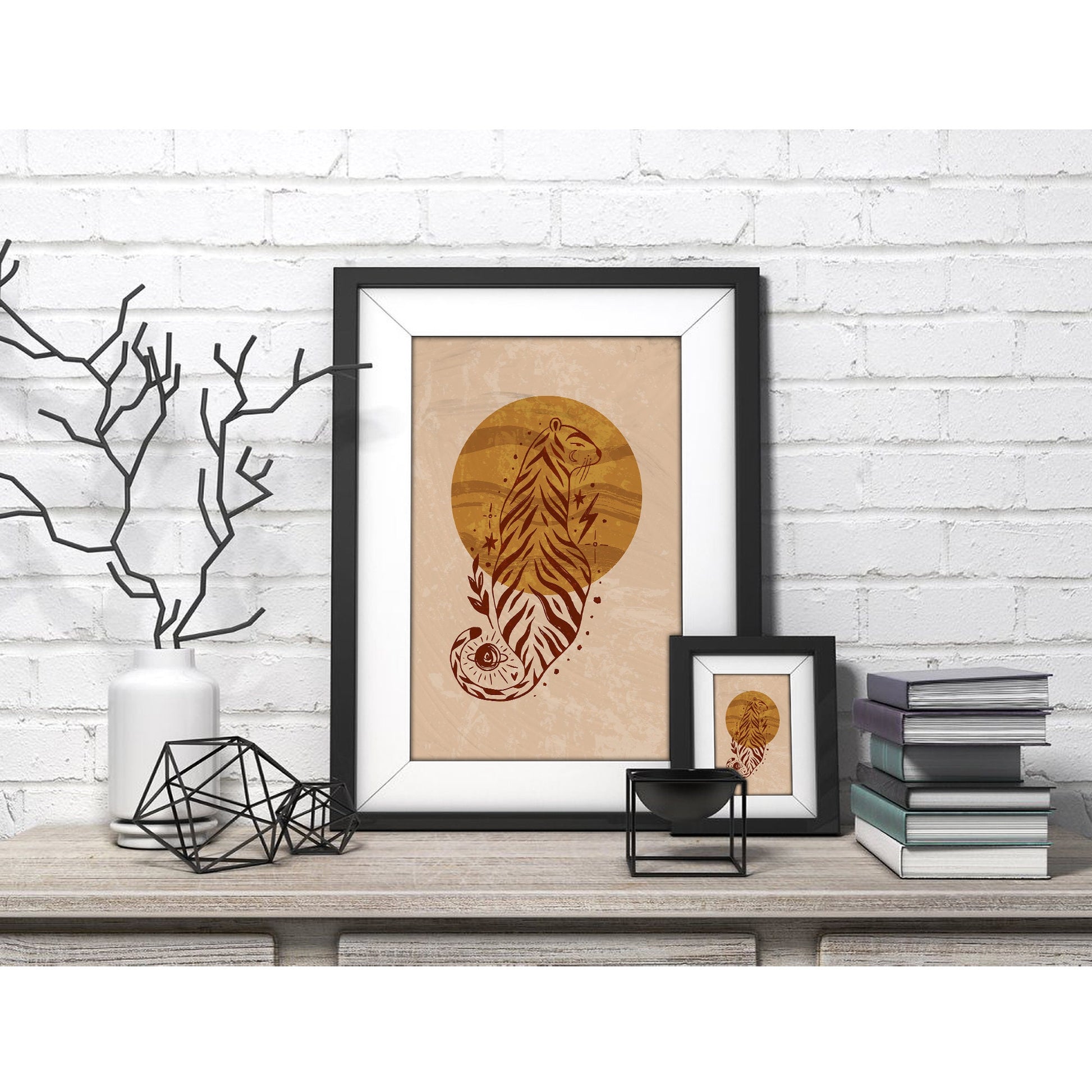 Embrace the power and mystery of our Mystical Tiger Art Print, where the wild meets the wondrous. This print features a beautifully detailed tiger, rendered with a mix of bohemian and celestial styles, set against a golden, star-filled circle that captures the imagination. Ideal for fans of luna and feminist art, this piece blends animal majesty with mystical elements to create a captivating visual experience. It's perfect for those who love unique art that serves as a focal point in any room, offering a story that compels the viewer to return again and again.