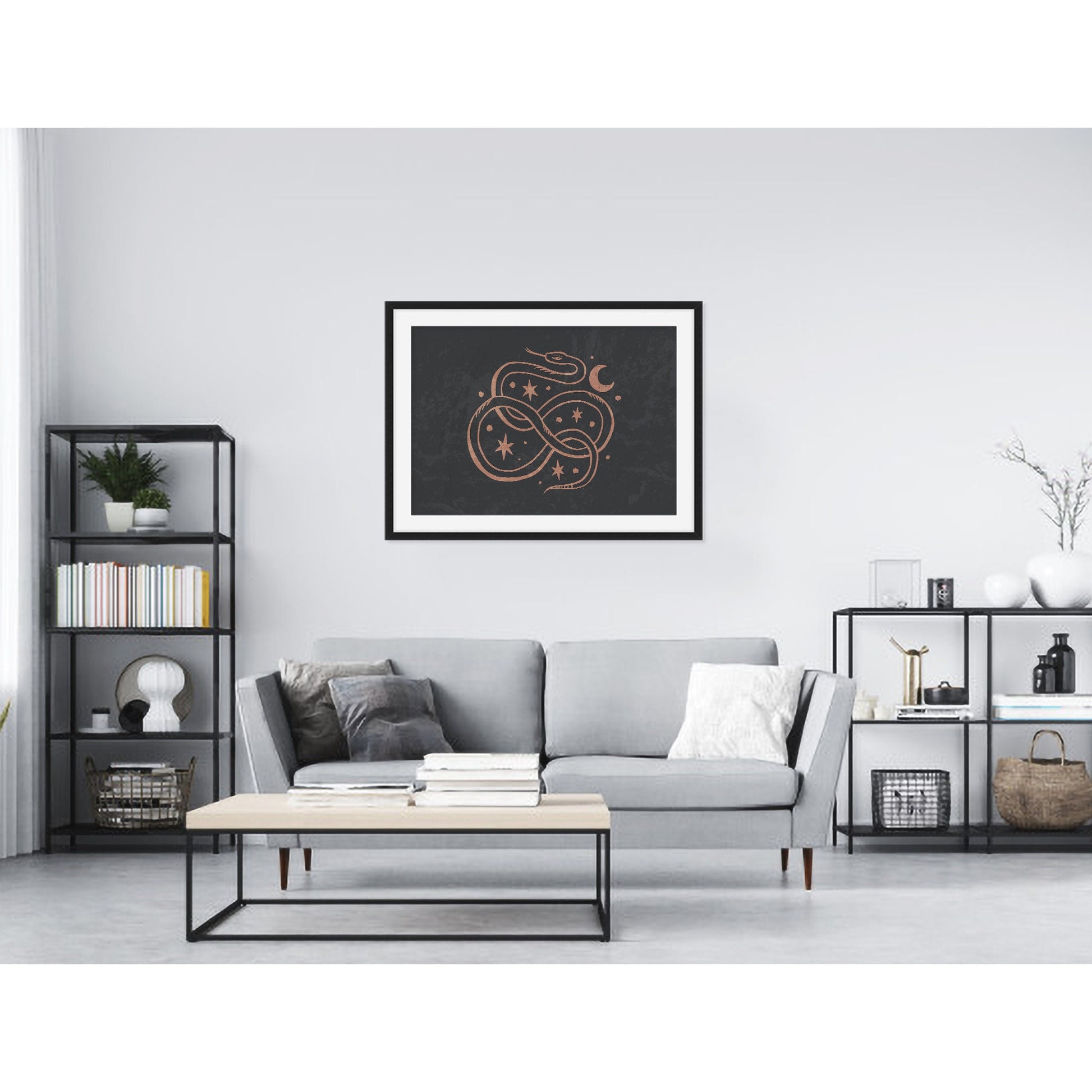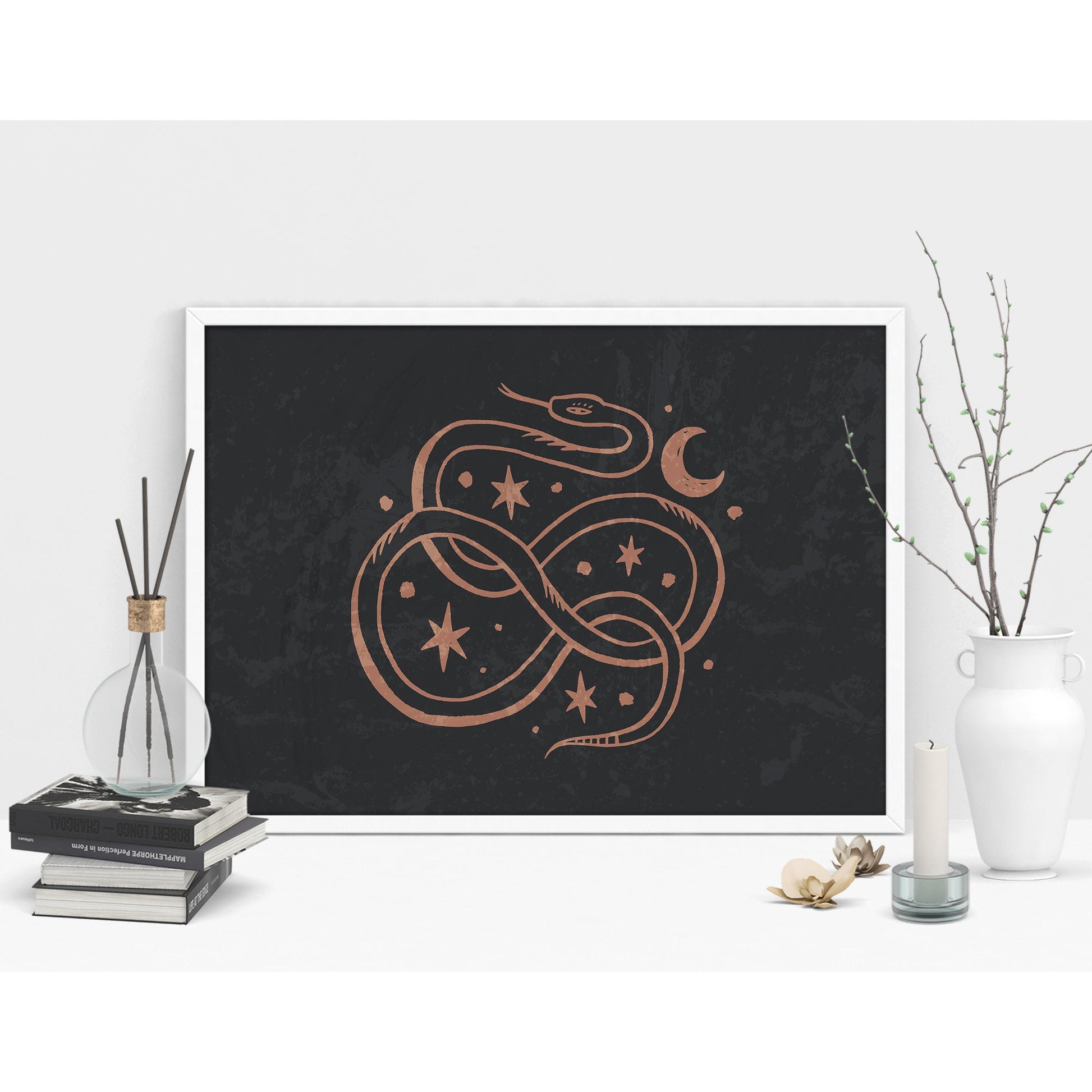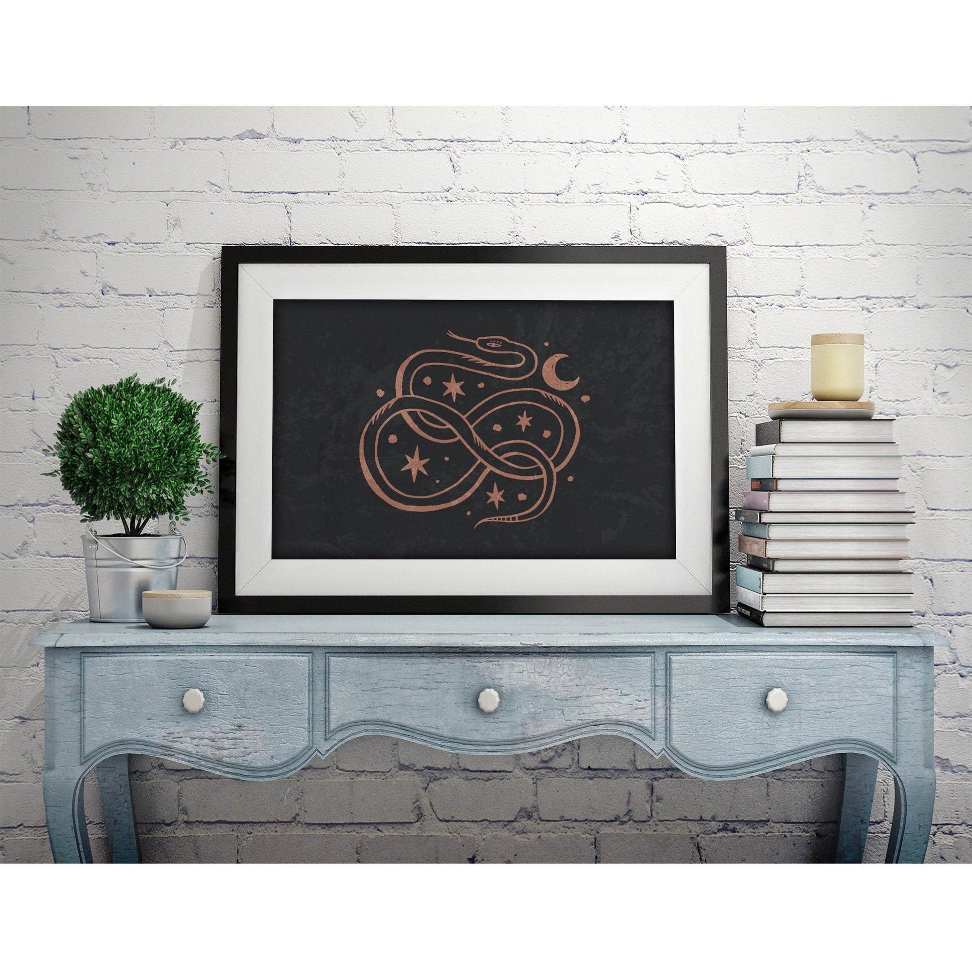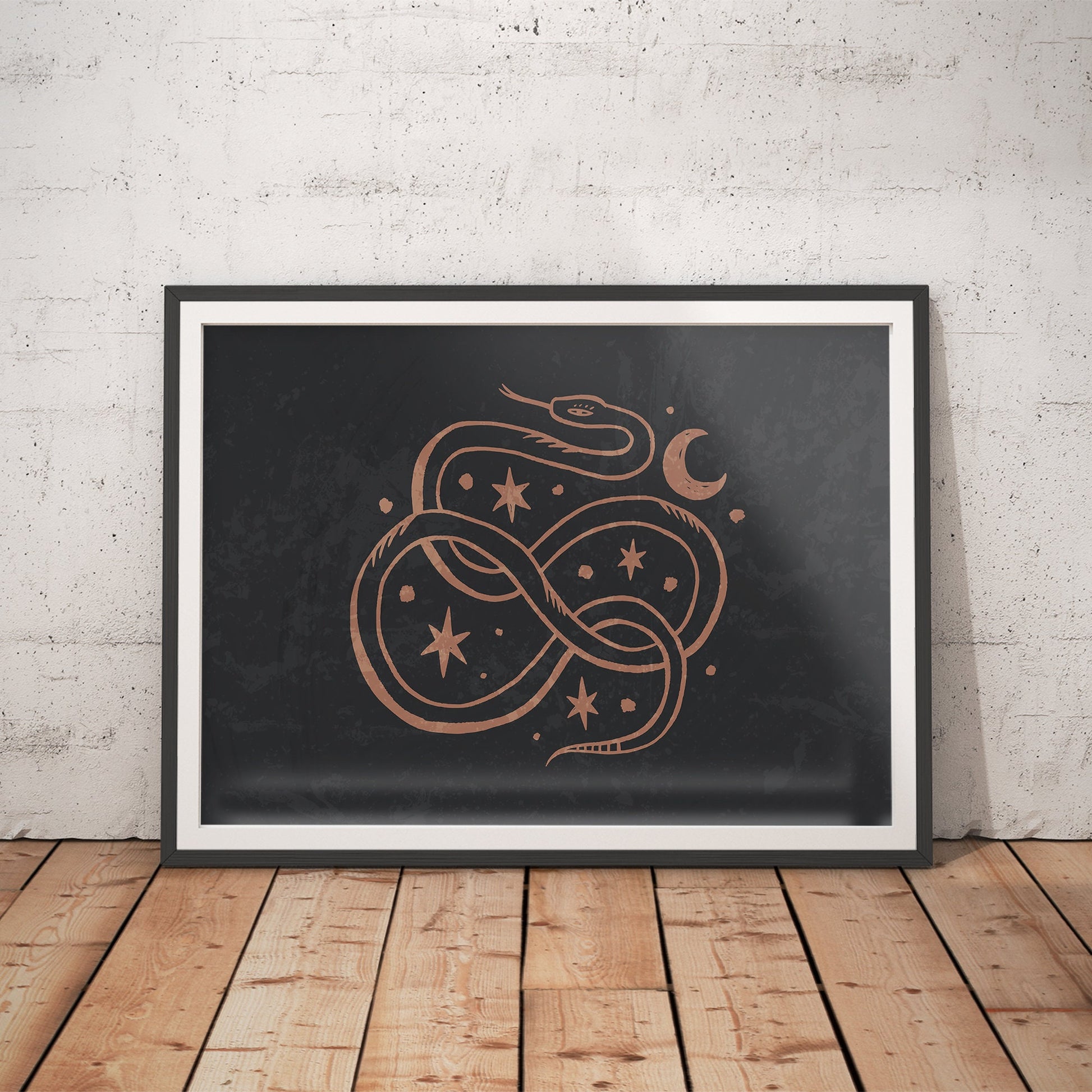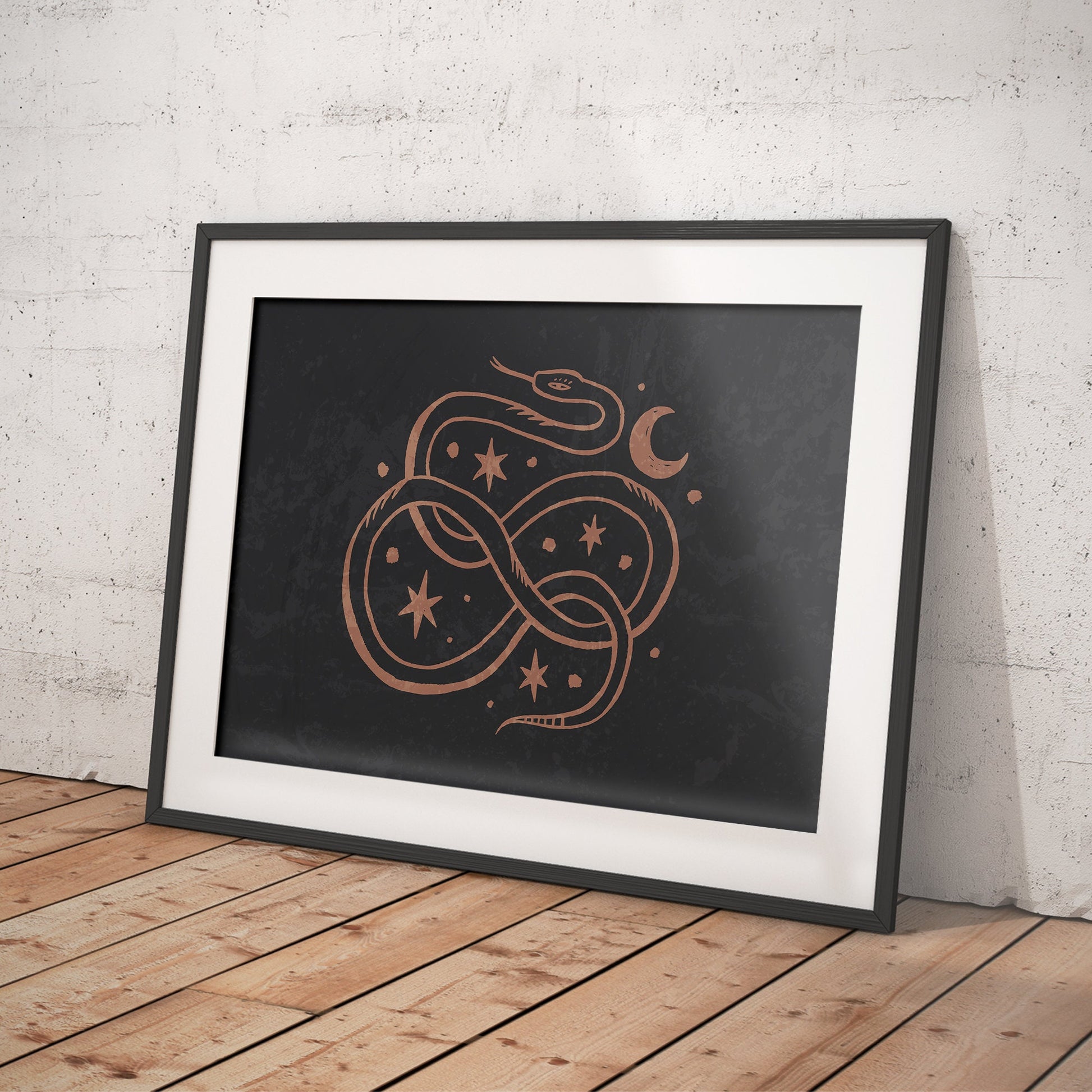 Discover the allure of the cosmos with our 'Serpentine Stars Art Print', where a mystical snake winds through a starry sky. This print is an ode to occult and celestial themes, designed with an elegant touch that complements any modern or bohemian setting. It's an ideal choice for those drawn to spiritual or mystical art, offering a unique visual experience that blends tradition with a modern twist. Perfect for anyone seeking a statement piece that's both captivating and tasteful, this print is sure to enchant viewers and transform any space into a haven of mystery.