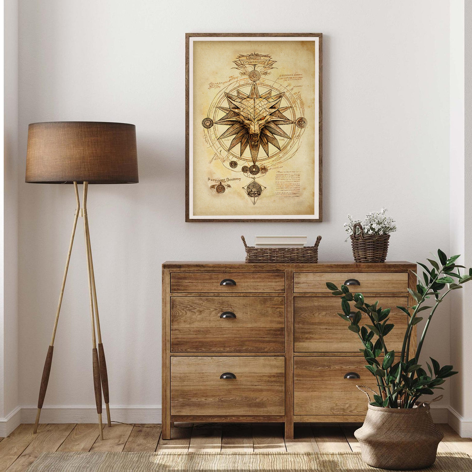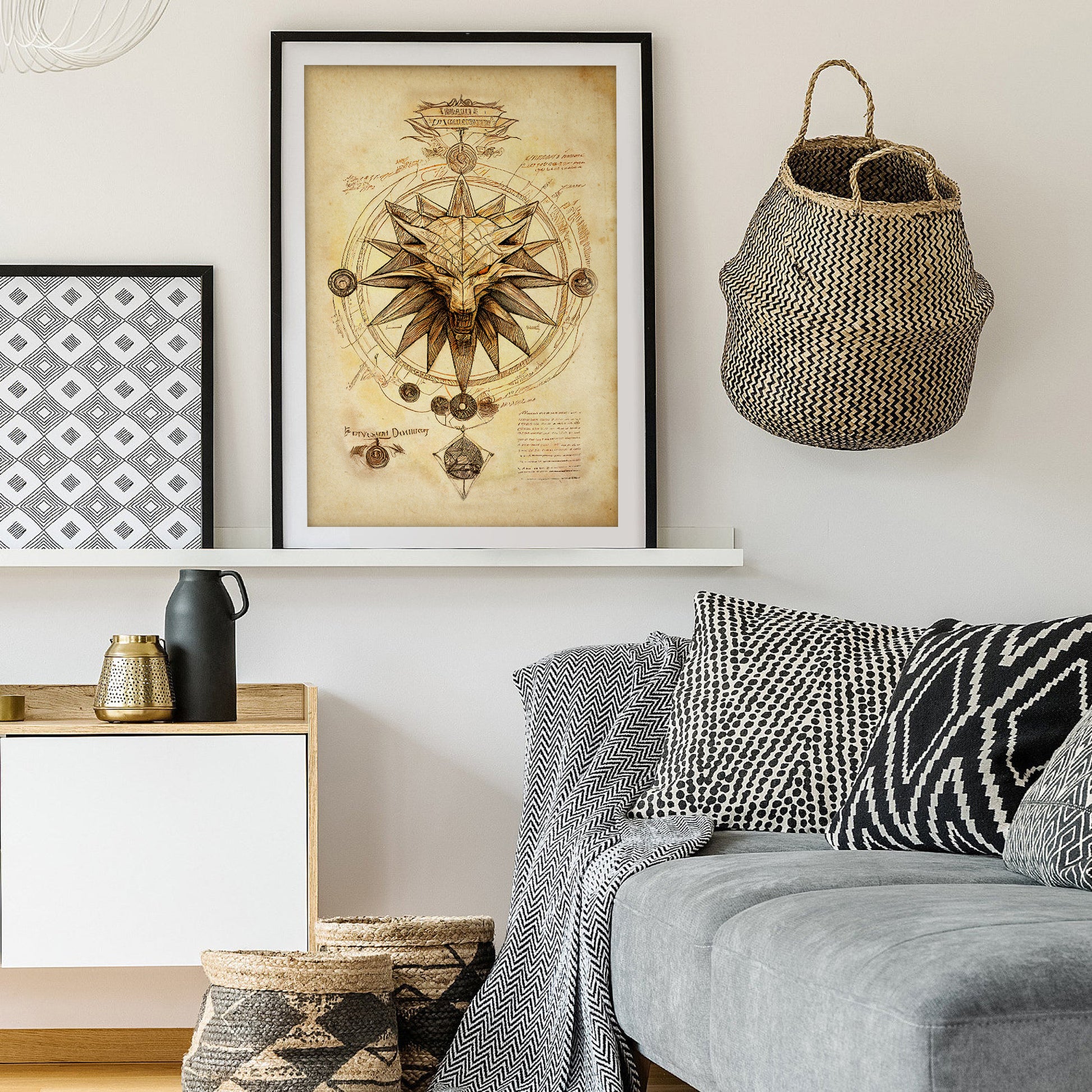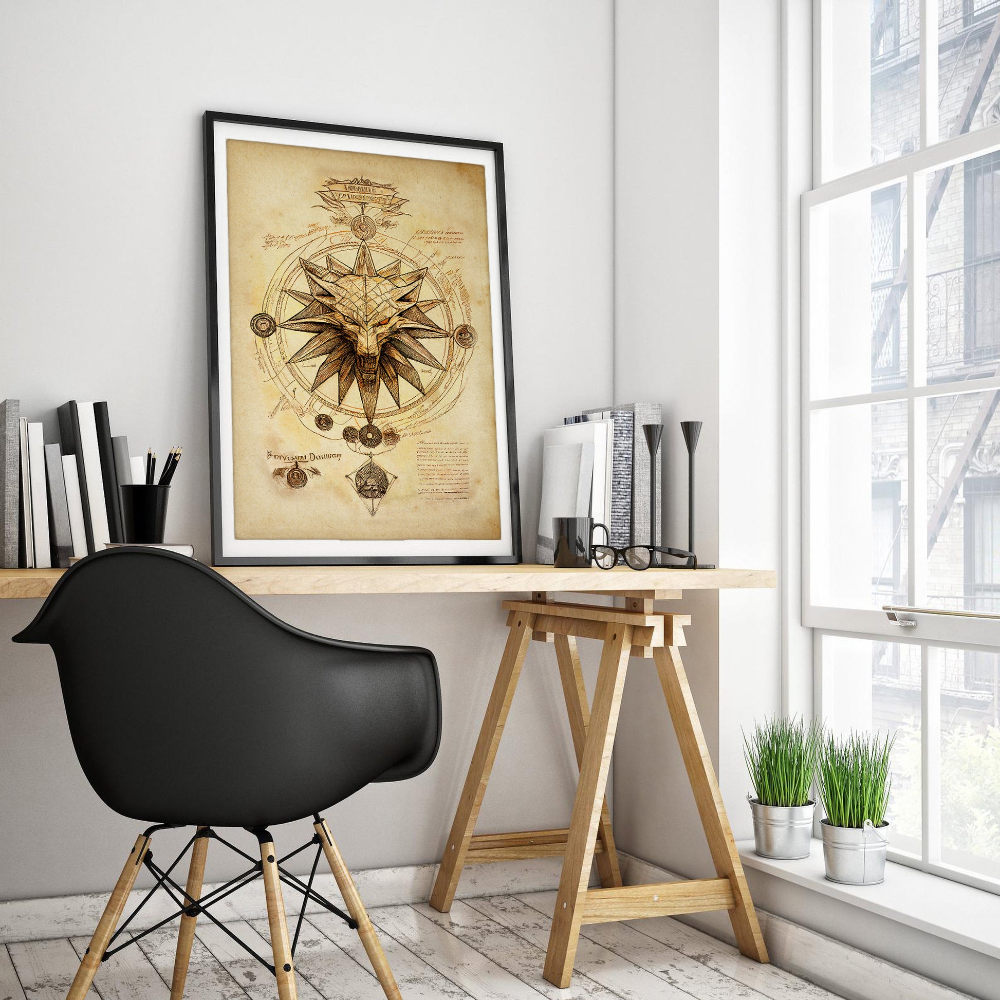 Unleash the power of the Witcher Wolf Emblem Art Print, a captivating blend of DaVinci-inspired design and the striking imagery of the Witcher series. This artistic print is perfect for fans of the game, TV series, and books, making it an ideal piece of wall art for gamers and pop culture aficionados. The detailed fusion art style highlights the fierce wolf medallion, bringing a touch of collector's item prestige to your decor. Whether for a teen's room or a dedicated fan's collection, this unique art print adds a sophisticated nod to retro gaming and geek decor.